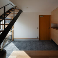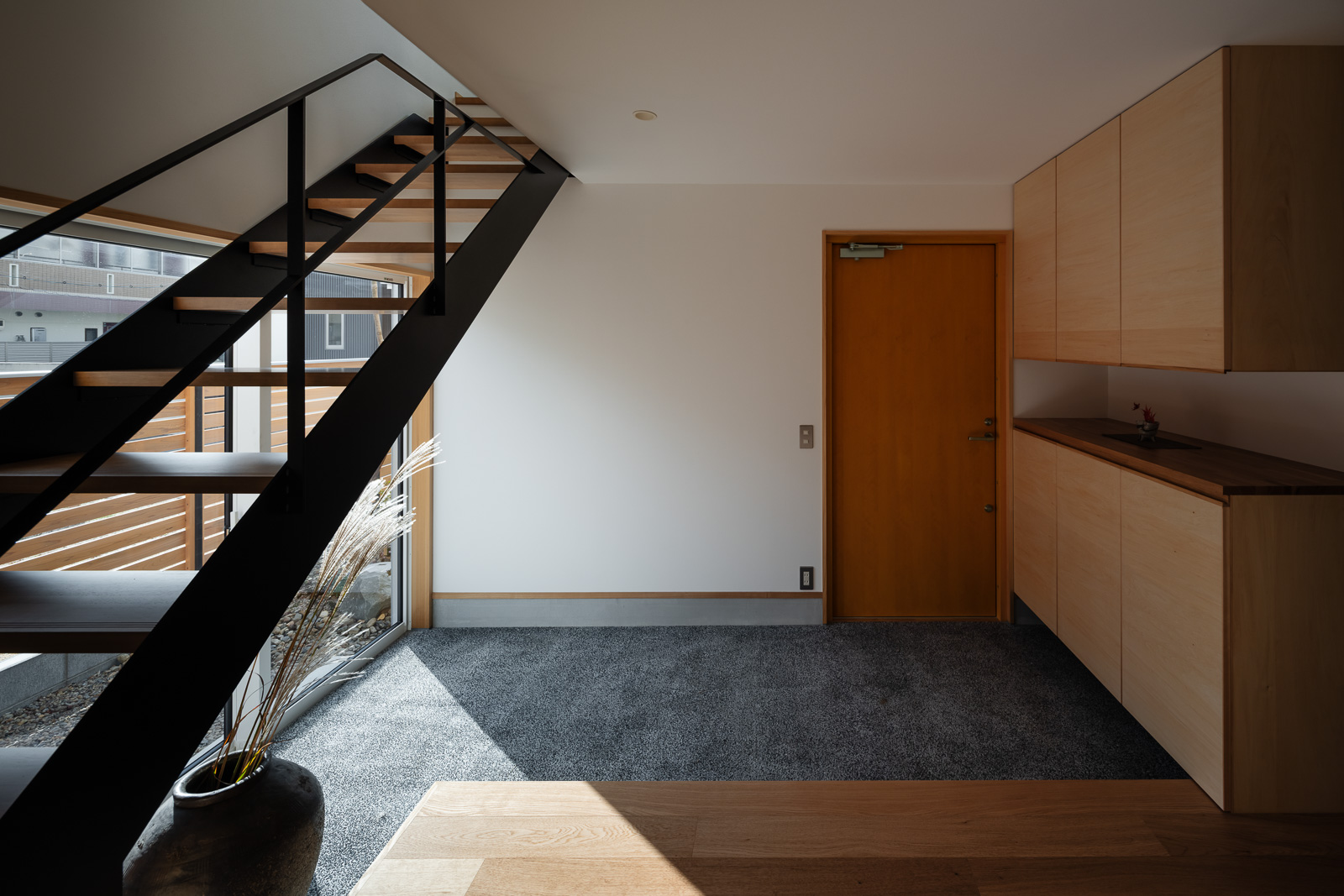 広々明るい玄関土間にかかるストリップ階段をあがると、
