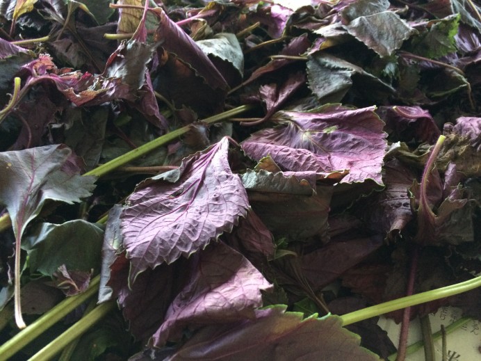 しそを葉っぱだけ取り、赤紫の葉っぱが緑になるまで煮ていく。。。