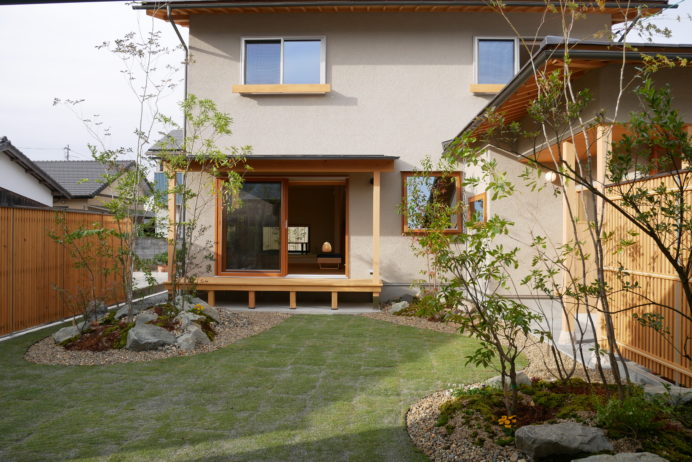 焼杉のガレージとお家の間には、芝生の中庭があり、