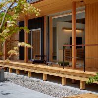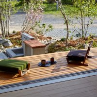 軒の深いウッドデッキは暑い夏の日や雨の日も庭を愉しむことができます。