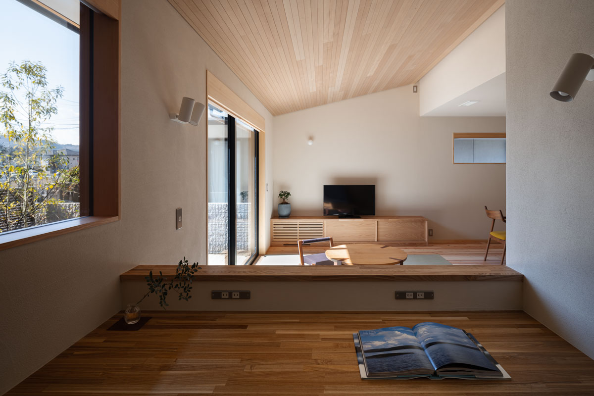 家族で過ごすリビングは、板張りの勾配天井と大きな窓で開放的に。